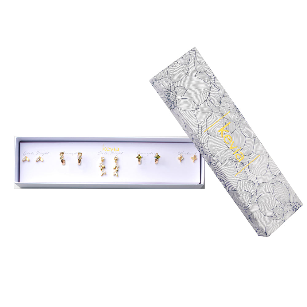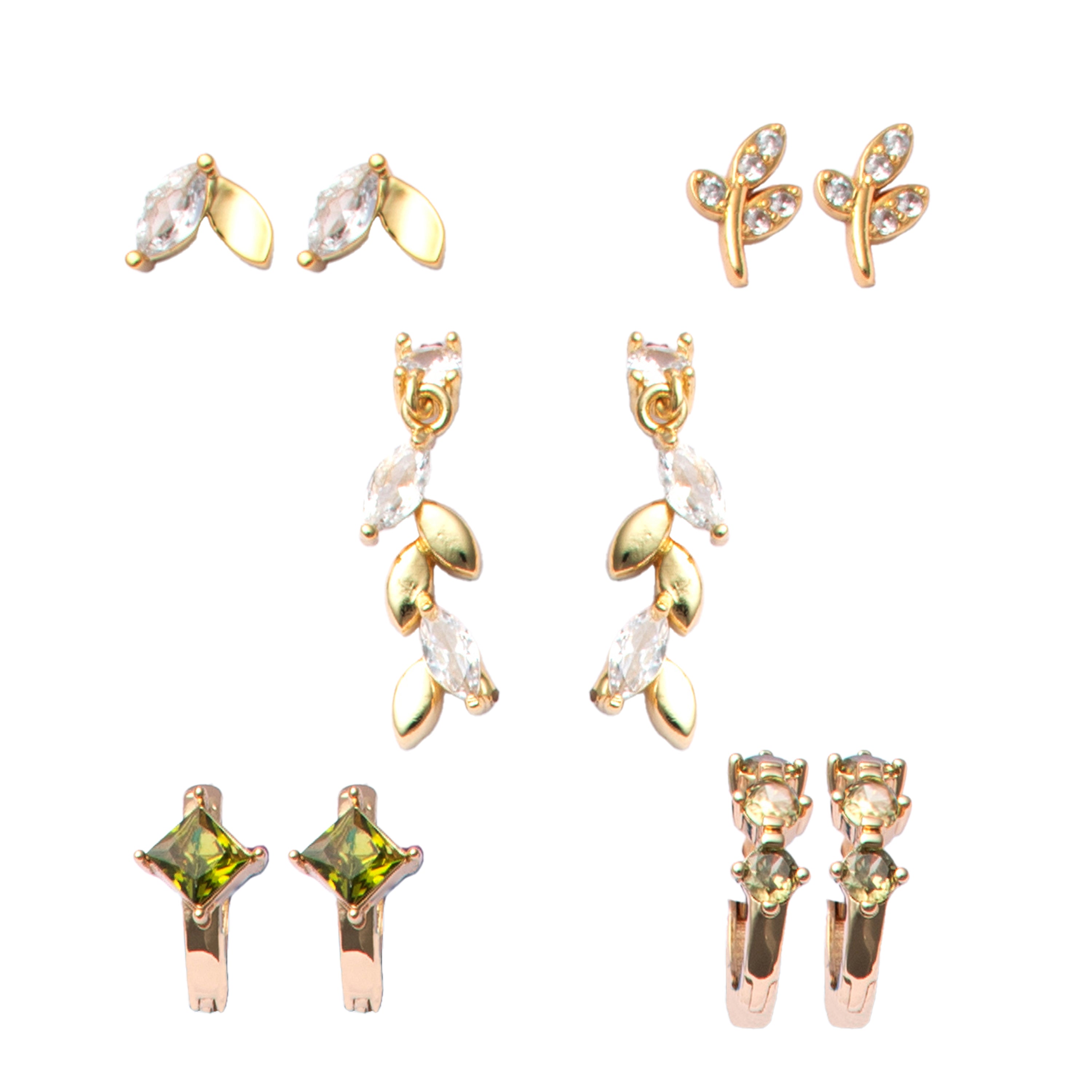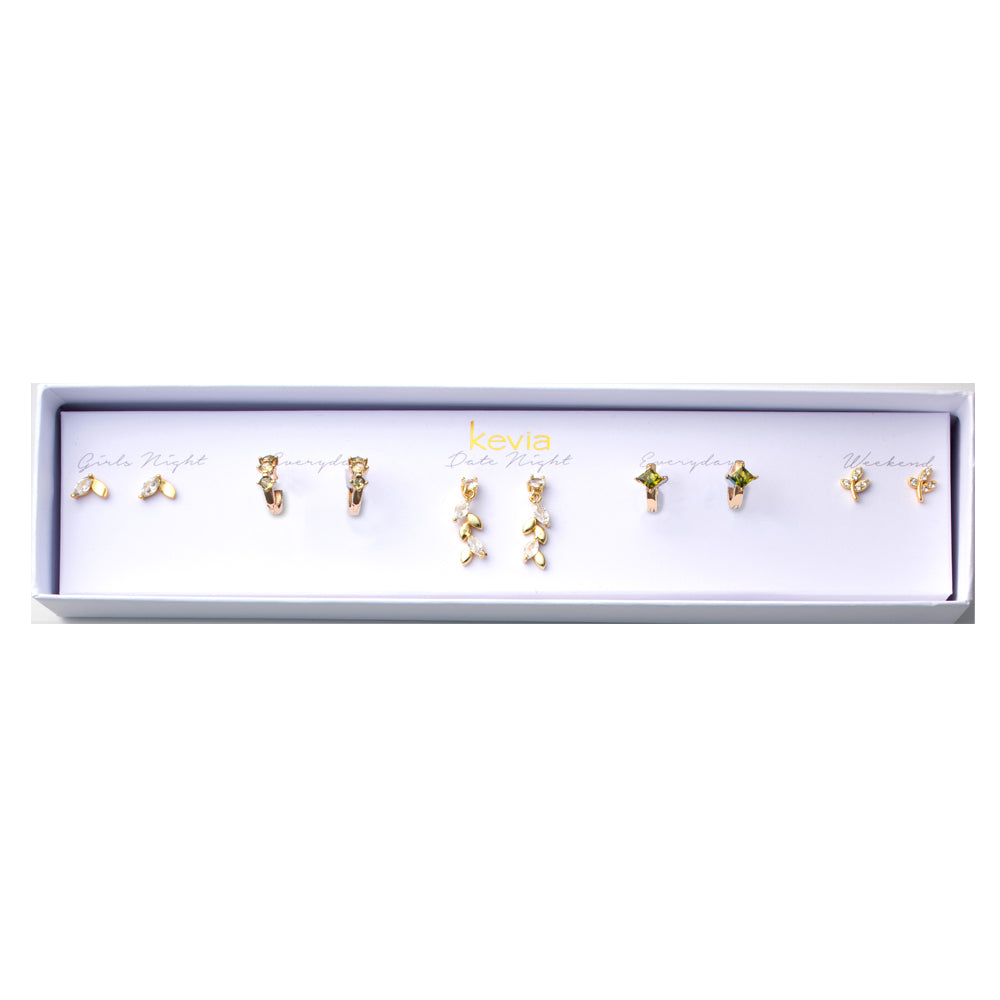 Soft green crystals and warm gold finishes define this five-pair earring set designed for versatile, everyday styling. The mix includes sculptural leaf studs, crystal-accent drops, and polished gold shapes that balance organic detail with modern shine. Wear a single pair for subtle elegance or rotate through all five to create an effortless, curated look.