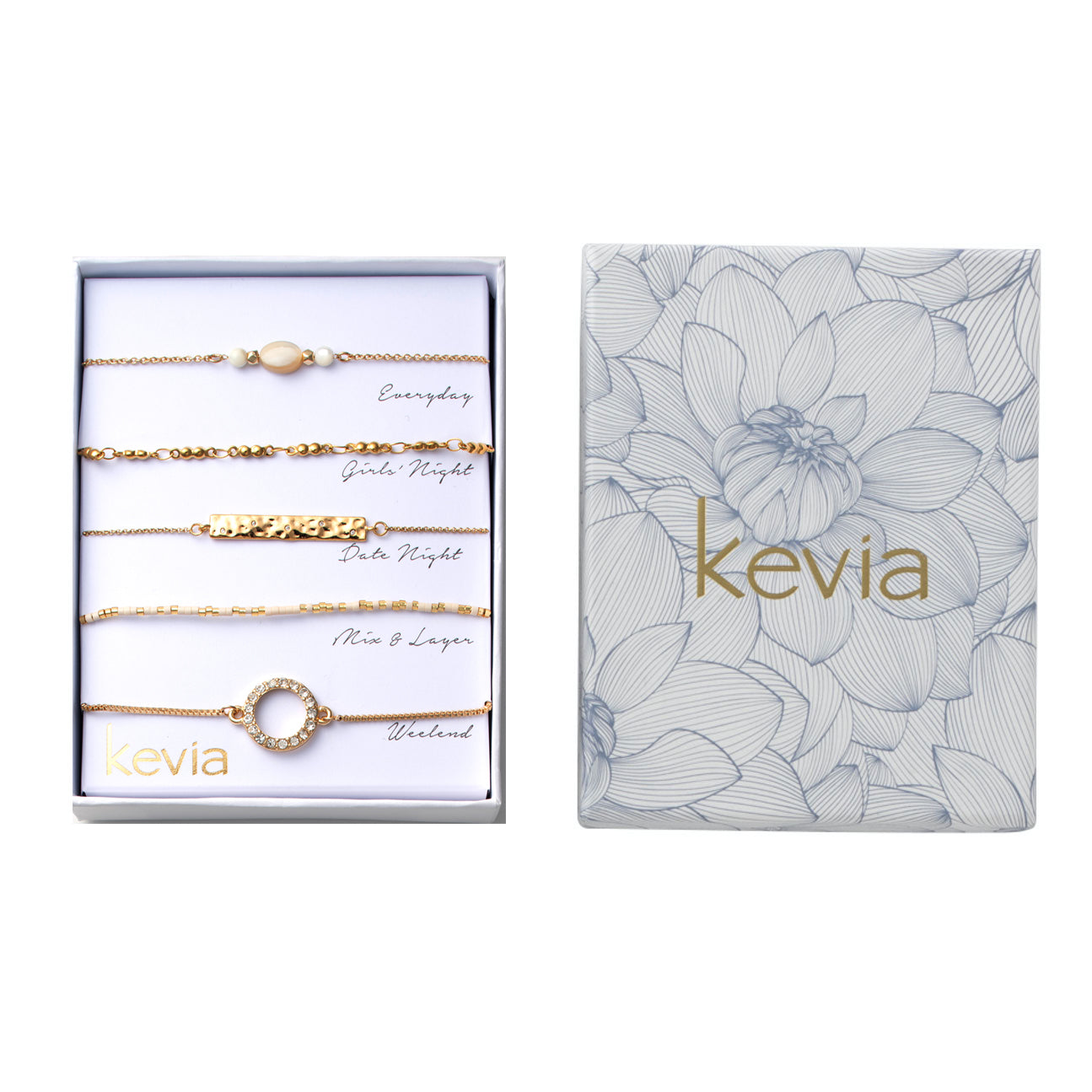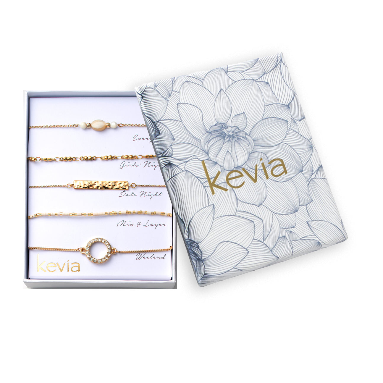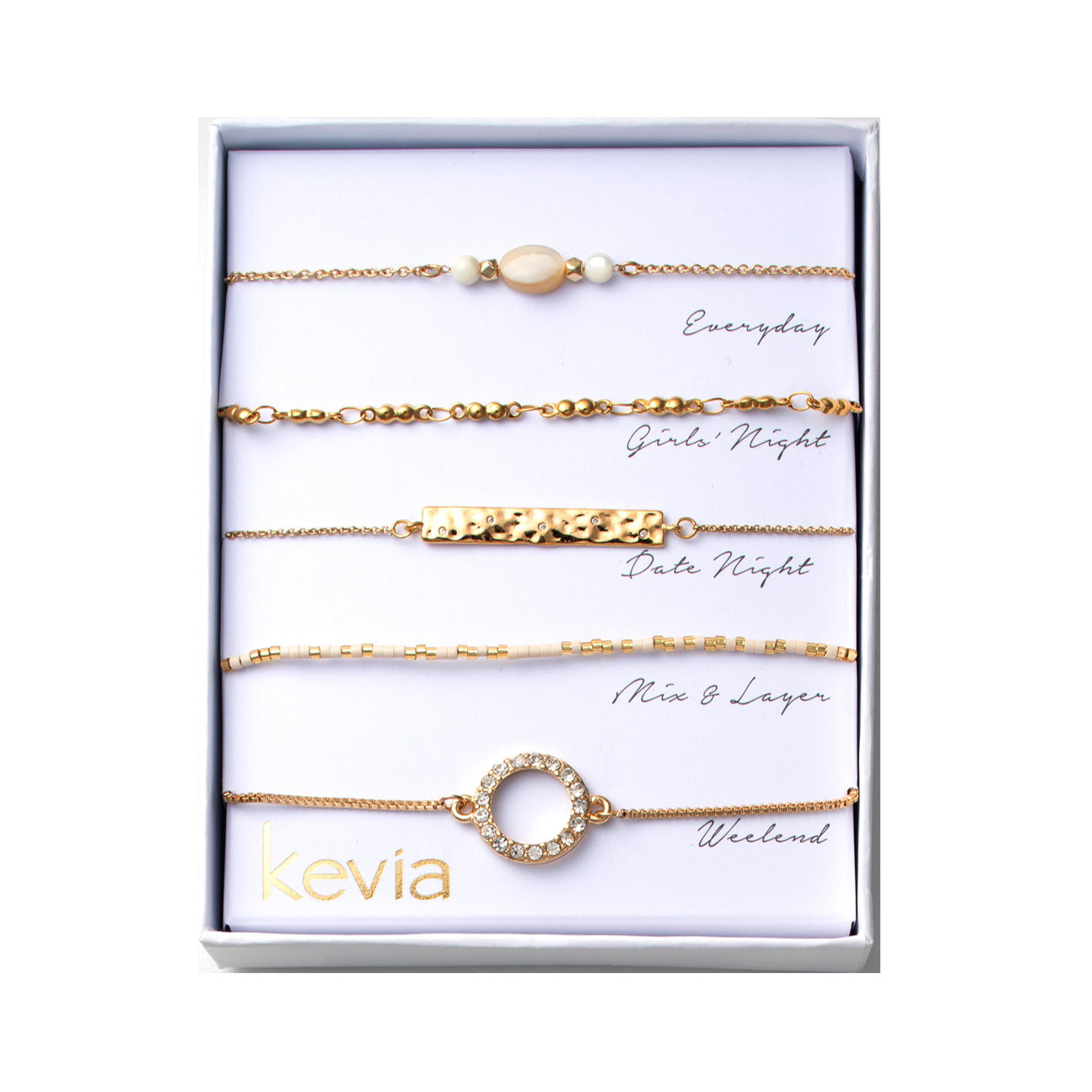 Soft cream tones and warm gold textures define this five-piece bracelet set, designed to feel polished yet effortless. The mix includes an oval cream bead bracelet with white accents, a gold beaded link bracelet, a hammered bar chain, a cream heishi bracelet detailed with gold, and a slider bracelet finished with an open pavé circle. Each piece layers cleanly or stands alone, offering a balanced mix of softness, texture, and modern shine for an elevated everyday look.