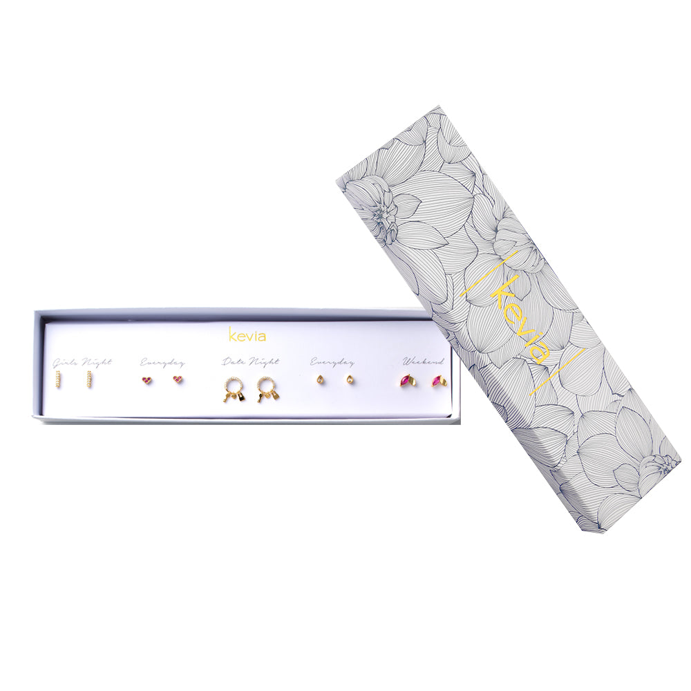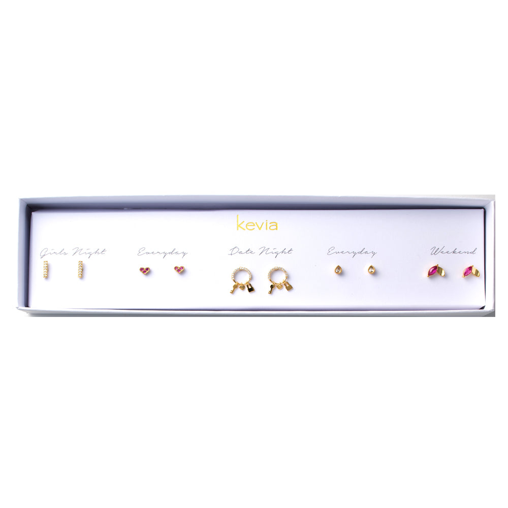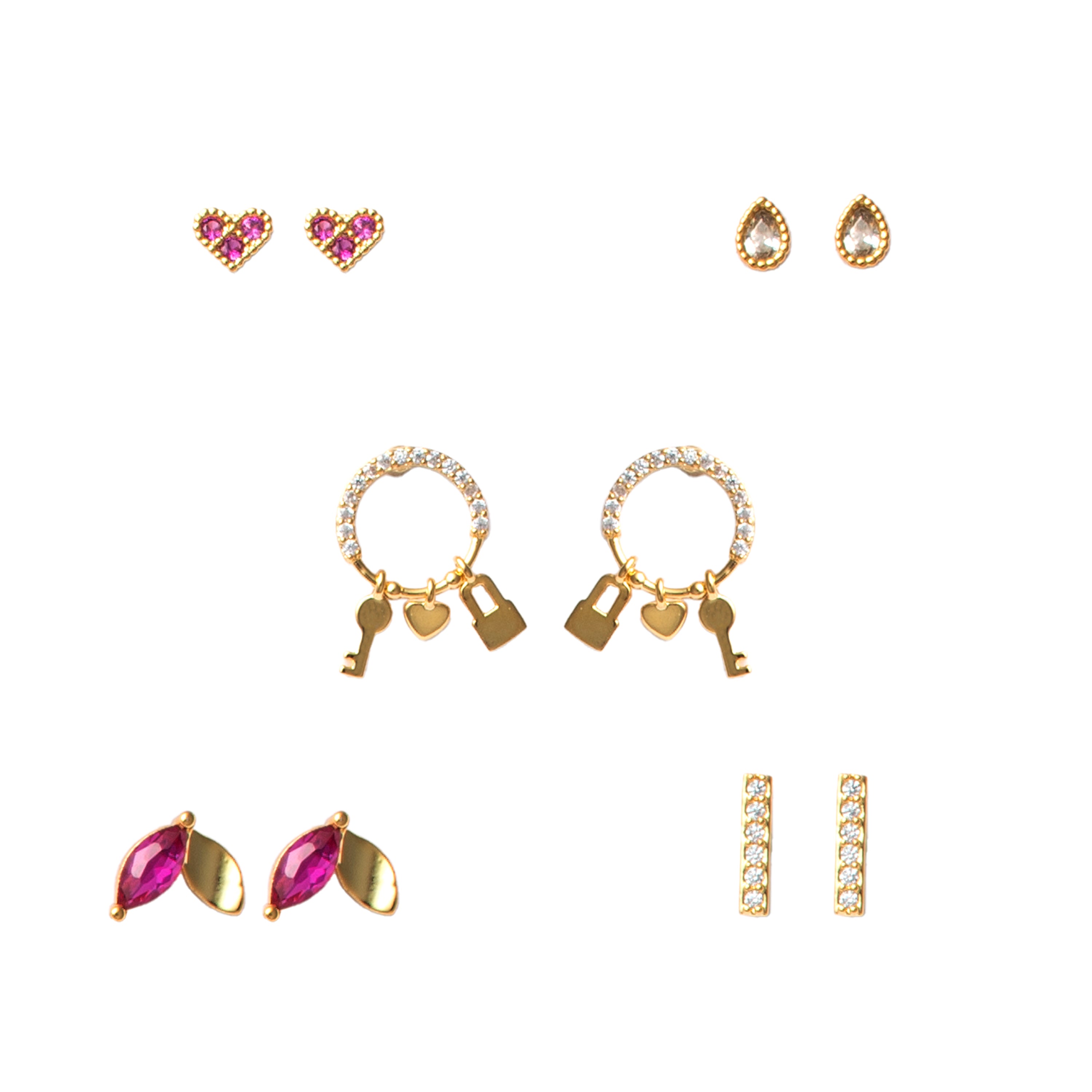 Hearts, pavé sparkle, and playful charm details define this five-pair gold earring set. The mix includes pavé heart studs, clear teardrop crystal studs, pavé bar studs, marquise-cut pink crystal studs with gold accents, and small pavé hoop earrings finished with heart, lock, and key charms. Designed for easy rotation, each pair offers a different balance of romance and shine.