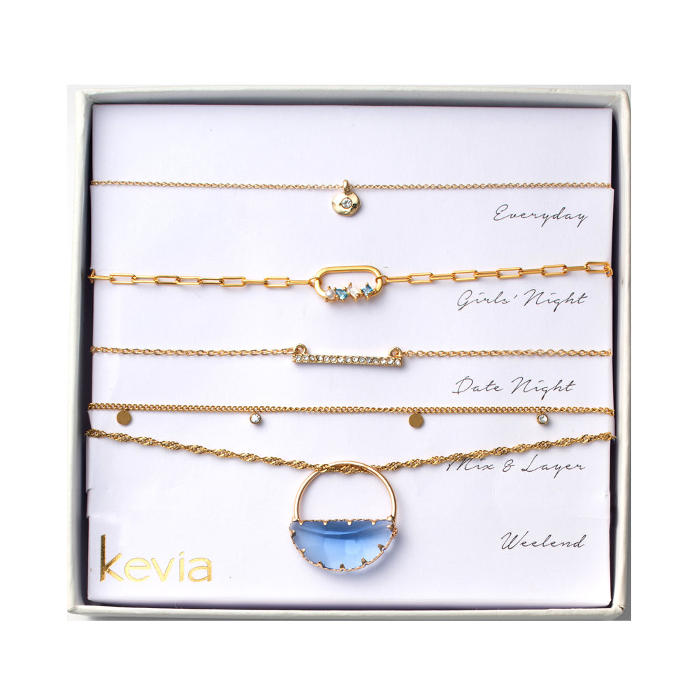 Designed with soft blue stone accents and a sculpted horizon pendant, this five piece necklace set brings calm structure to modern layering. The set includes a petite round charm necklace, a paperclip style chain with small blue crystal details, a slim crystal bar necklace, a fine chain with minimal gold disc accents, and a curved blue stone pendant framed in gold. Wear each piece on its own for subtle balance or layer several together for a refined, effortless look.
